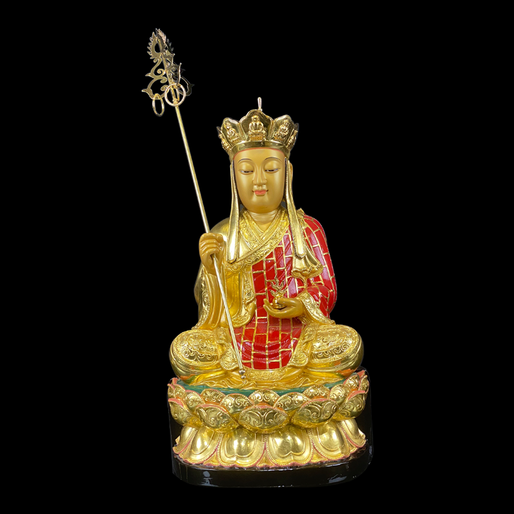 Tư thế: Ngồi đài sen, tay cầm tích trượng và minh châu