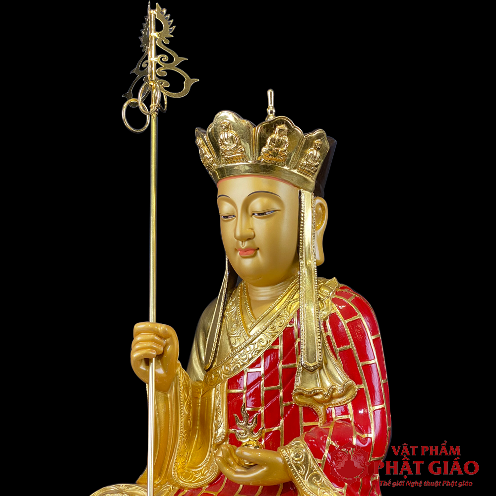 Tượng Địa Tạng Vương Bồ Tát Ngồi được chế tác từ gỗ long não nguyên khối, dát vàng 998 cao cấp, mang đến vẻ đẹp trang nghiêm và sang trọng. Hình tượng Bồ Tát ngồi trên đài sen, tay cầm tích trượng và minh châu, biểu trưng cho trí tuệ, lòng từ bi và hạnh nguyện cứu độ chúng sinh khỏi khổ đau, đặc biệt nơi địa ngục.
