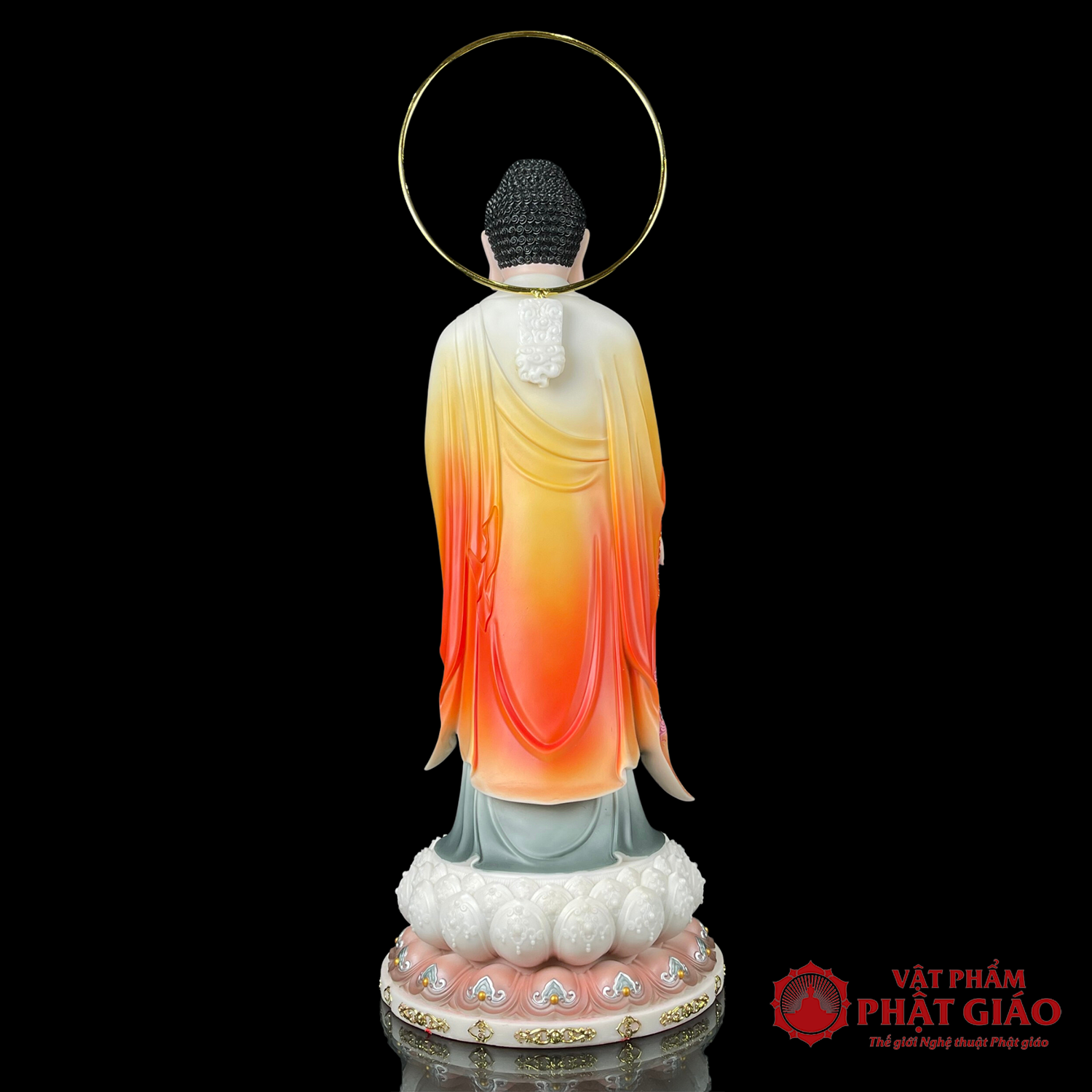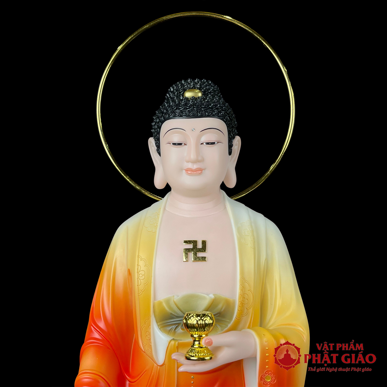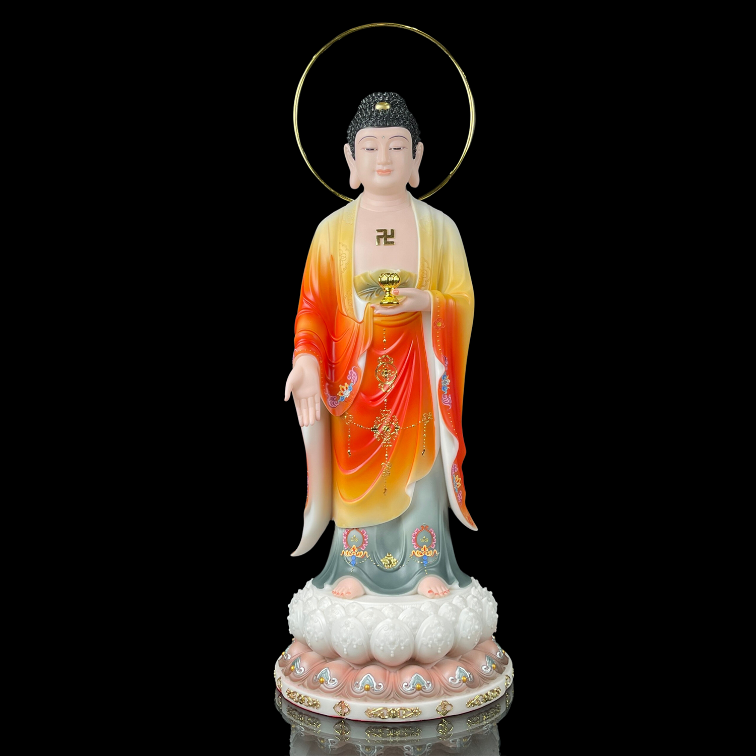 Đức Phật A Di Đà tượng trưng cho Vô Lượng Quang và Vô Lượng Thọ. Thờ tượng Phật A Di Đà giúp gia chủ gieo duyên lành với cõi Tây Phương Cực Lạc, buông bỏ phiền não, nuôi dưỡng lòng từ bi và trí tuệ. Tư thế đứng kết ấn tiếp dẫn biểu thị cho sự tiếp độ chúng sinh, dẫn dắt về cõi an lạc. Hào quang phía sau tượng trưng cho trí tuệ chiếu soi, diệt trừ vô minh và bảo hộ gia đạo.