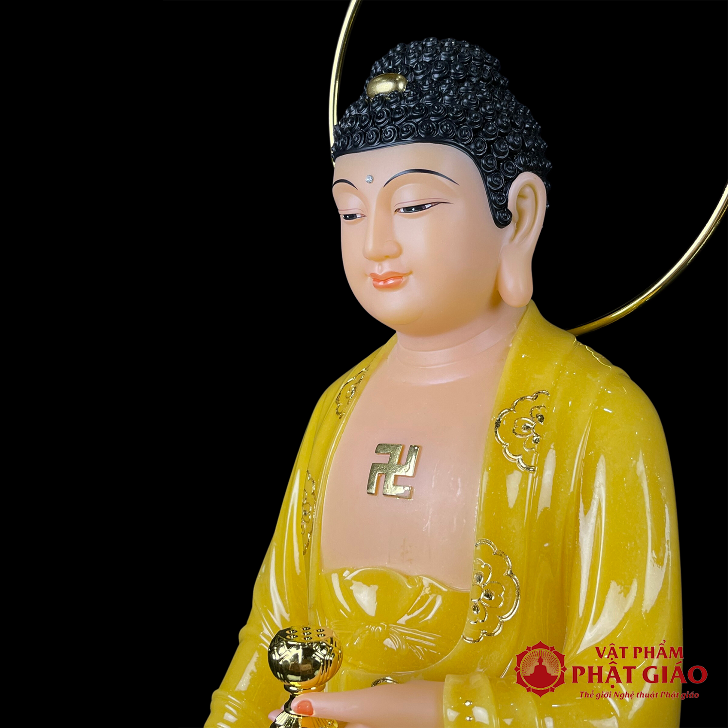 Tượng Phật A Di Đà đứng bằng bột đá thạch anh viền vàng là mẫu tượng cao cấp, mang vẻ đẹp trang nghiêm và tinh xảo. Tượng được chế tác từ chất liệu bột đá thạch anh sáng bóng, viền vàng sang trọng, tôn lên thần thái từ bi, trí tuệ của Đức Phật A Di Đà – vị Phật chủ tôn cõi Tây Phương Cực Lạc.
