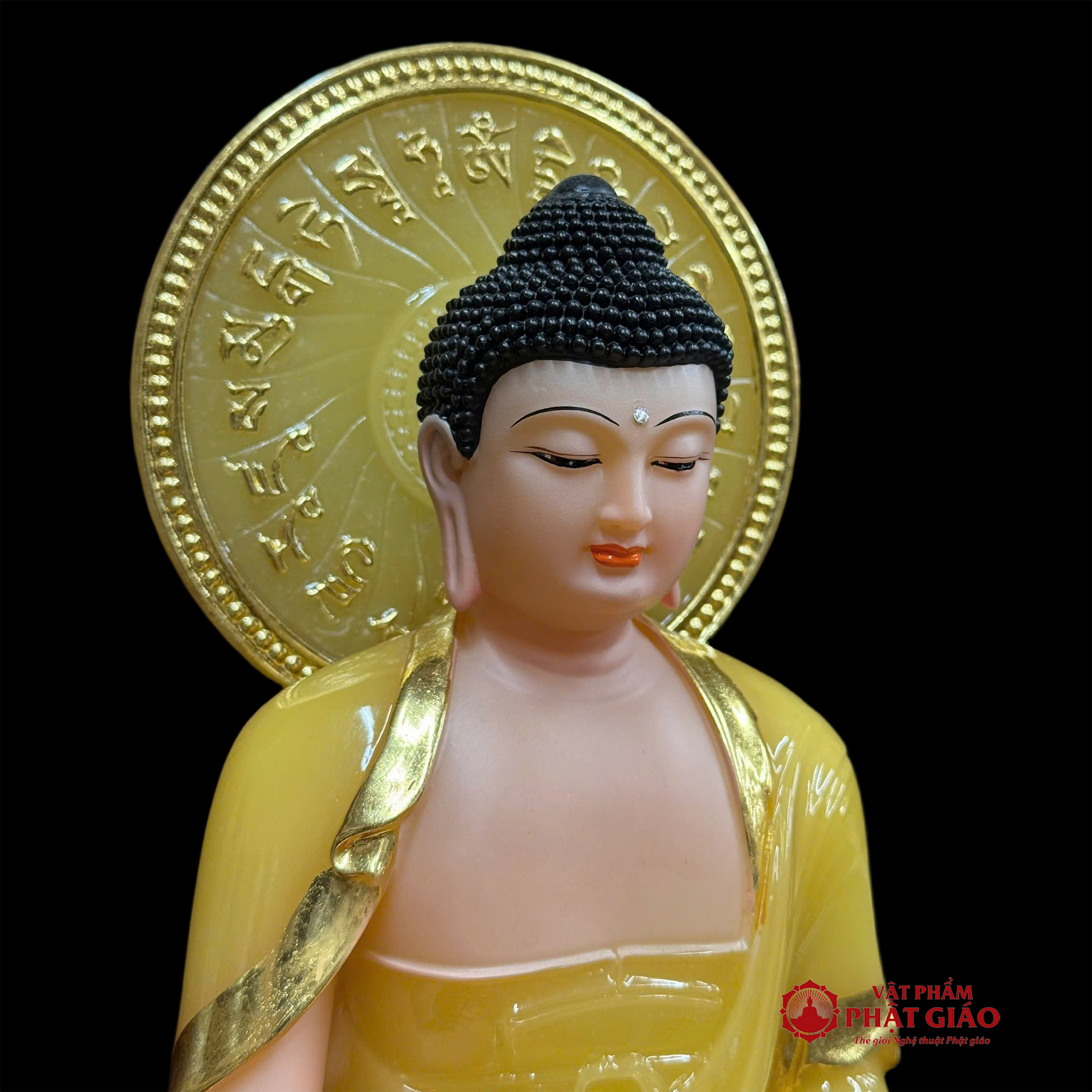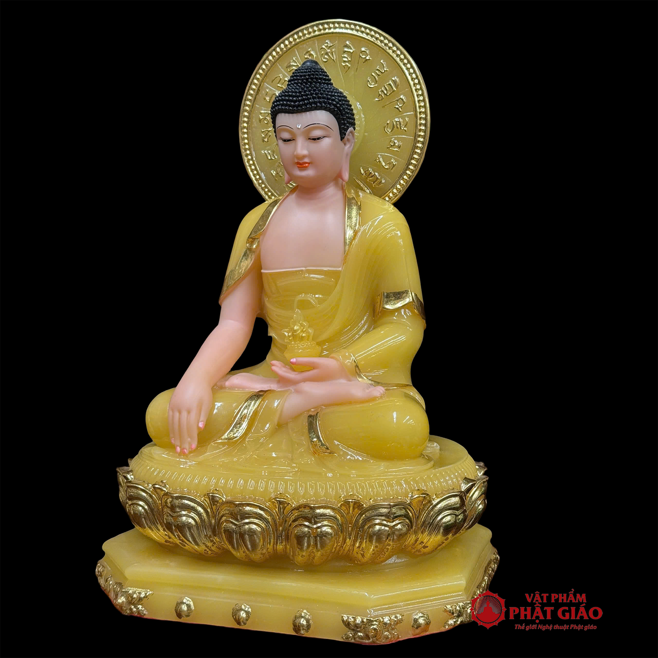 - Chất liệu: Tượng được chế tác từ bột đá cao cấp, phủ lớp sơn màu thạch anh vàng trong sáng và sang trọng. Từng đường nét khuôn mặt, y phục và ấn tay được thể hiện tinh tế, toát lên thần thái từ bi, an nhiên và trí tuệ của Đức Phật Dược Sư.