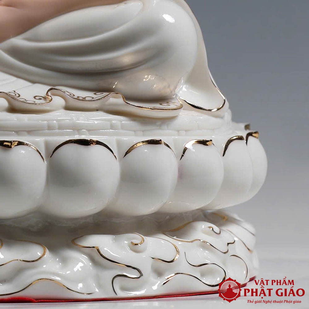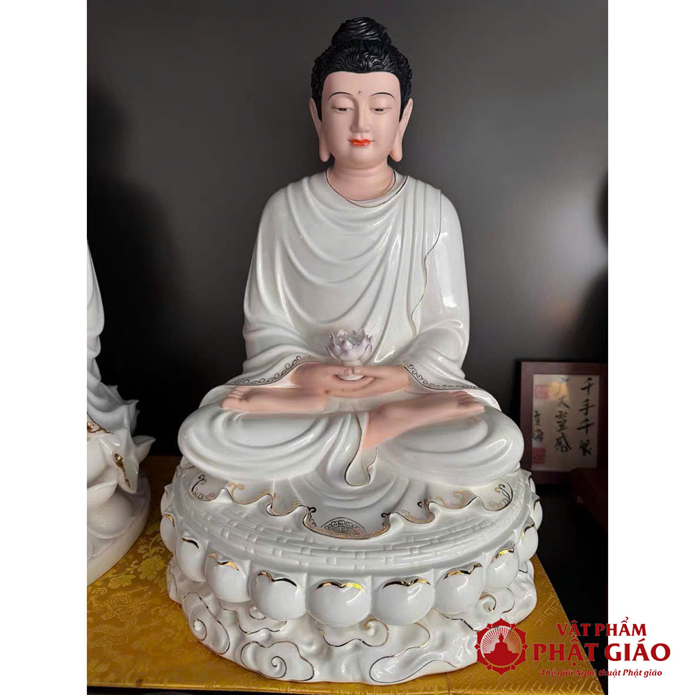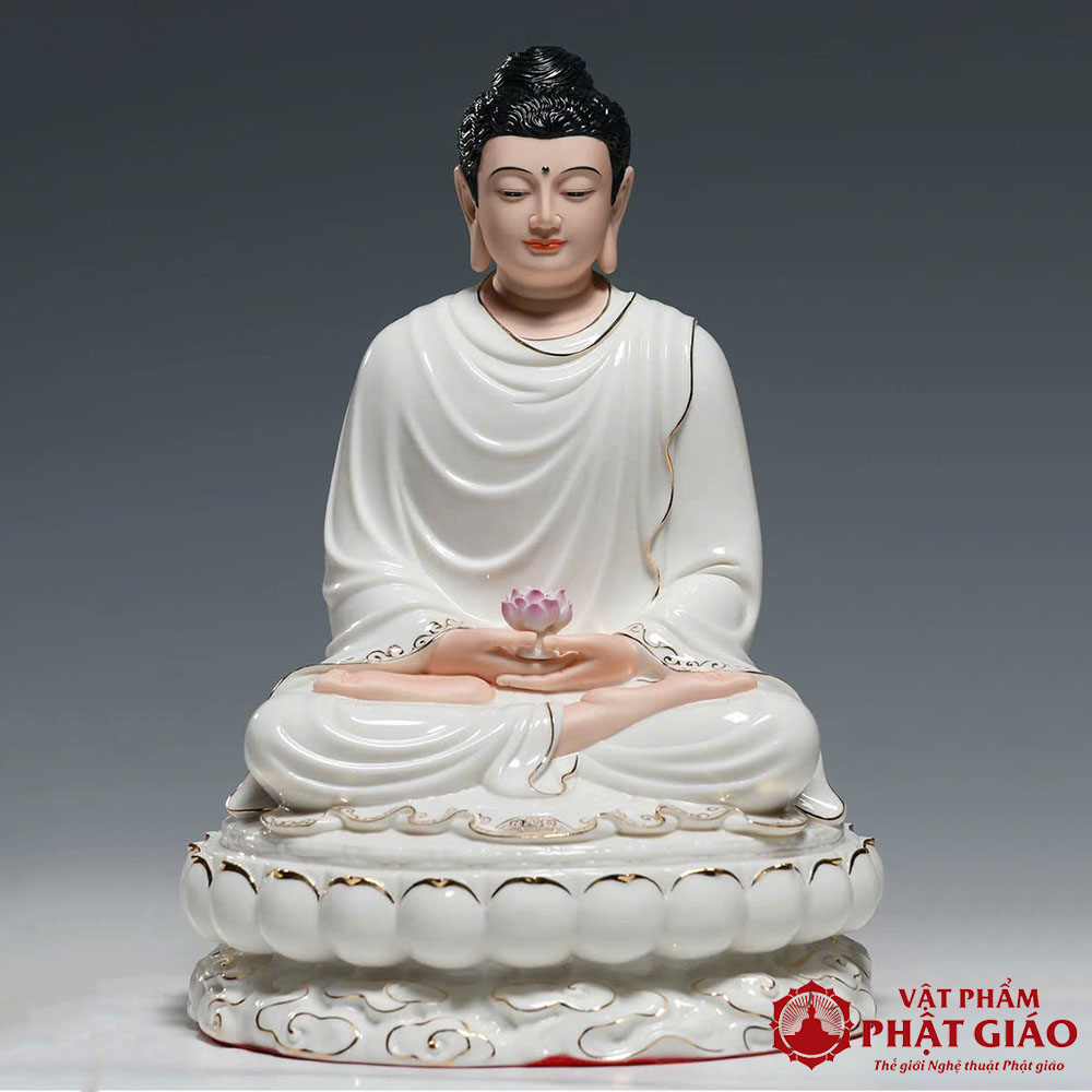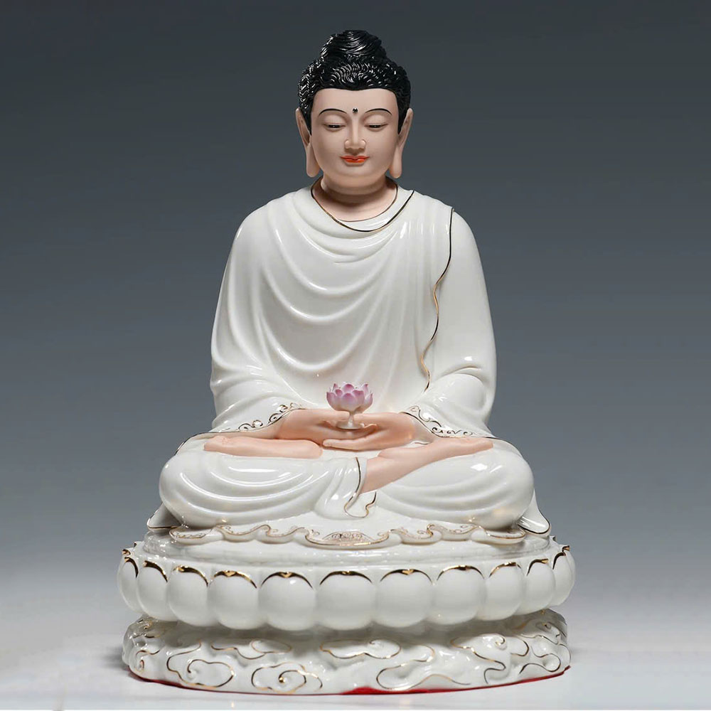 Tượng Phật Thích Ca Mâu Ni Bằng Gốm Sứ Cao Cấp Y Trắng Viền Vàng, Cao 30cm 40cm 48cm