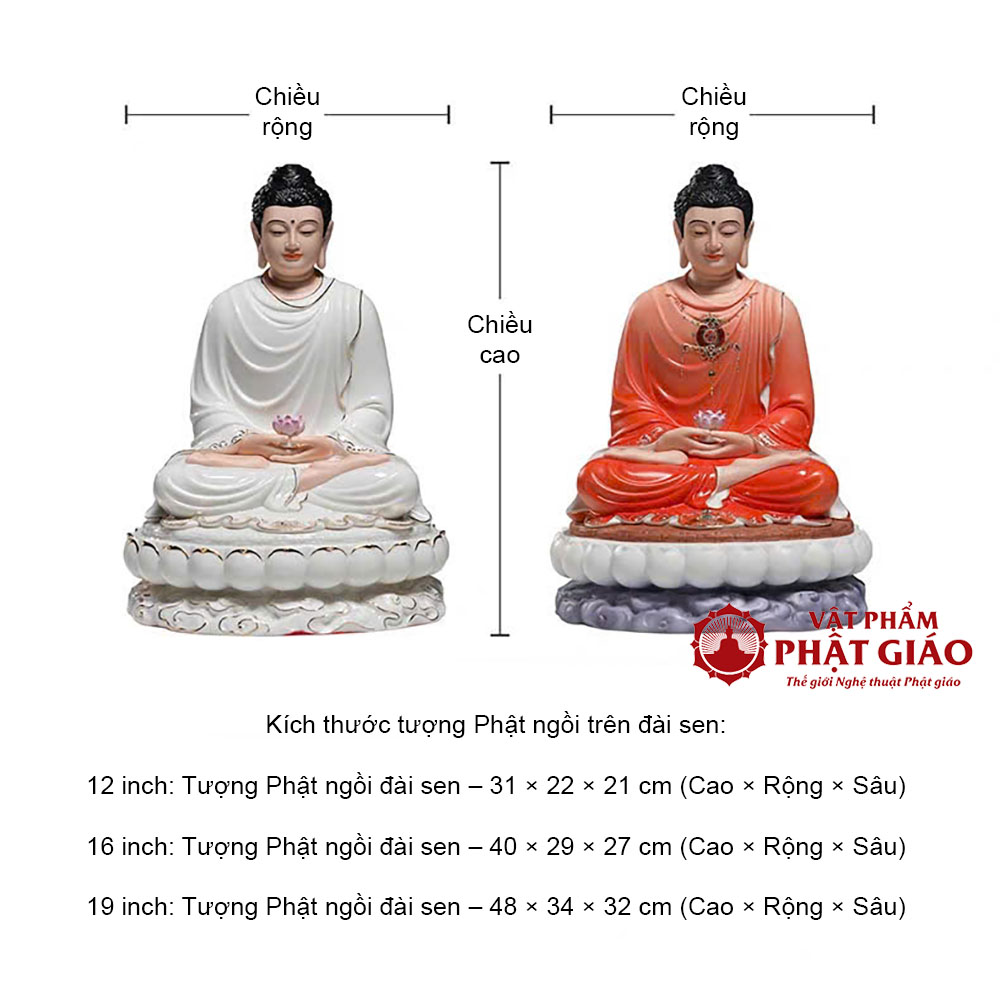 Thiết kế: Tượng Đức Phật Thích Ca Mâu Ni ngồi thiền định trên đài sen, tay nâng hoa sen hồng, gương mặt an nhiên, từ bi