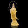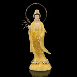 Tượng Quan Âm Bồ Tát được tạo tác từ bột đá pha màu thạch anh vàng, thể hiện dáng đứng trang nghiêm trên song liên (hai đài sen) – tượng trưng cho sự giác ngộ và tịnh hóa từ hai cõi (trí tuệ và từ bi). Gương mặt Bồ Tát hiền từ, ánh mắt từ ái, tay cầm nhành dương liễu và tịnh bình ban cam lộ – mang đến cảm giác an lành, nhẹ nhàng cho người chiêm bái.