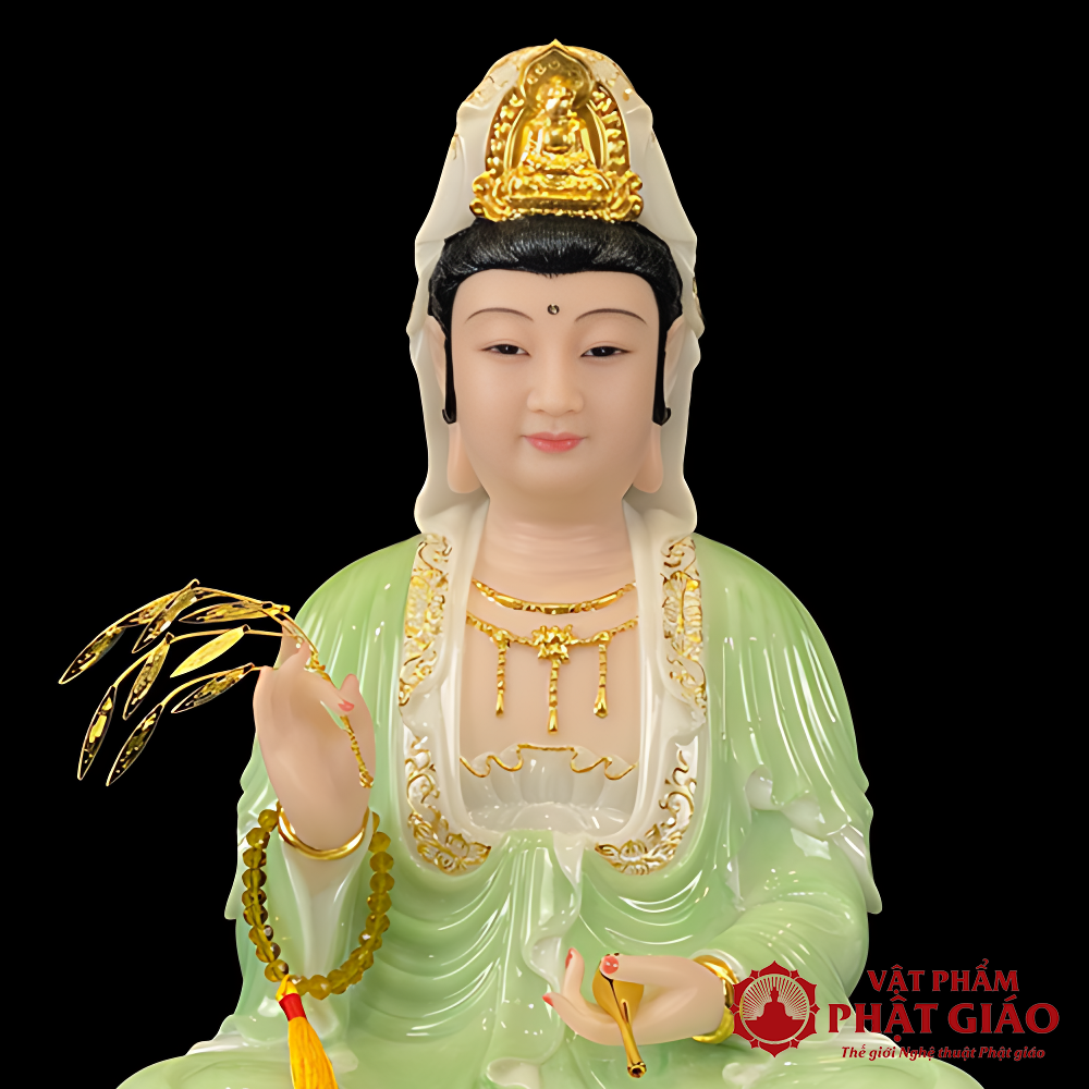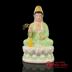 Tượng Quan Âm Bồ Tát ngồi đài sen được chế tác từ bột đá cao cấp, phối màu xanh ngọc – trắng nhẹ nhàng thanh thoát, kết hợp viền vàng nổi bật ở hoa văn và trang sức, tạo nên tổng thể hài hòa, trang nghiêm mà vẫn nhẹ nhàng tinh tế. Đây là mẫu tượng rất được ưa chuộng trong không gian thờ tại gia và phòng thiền.
