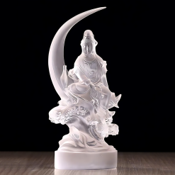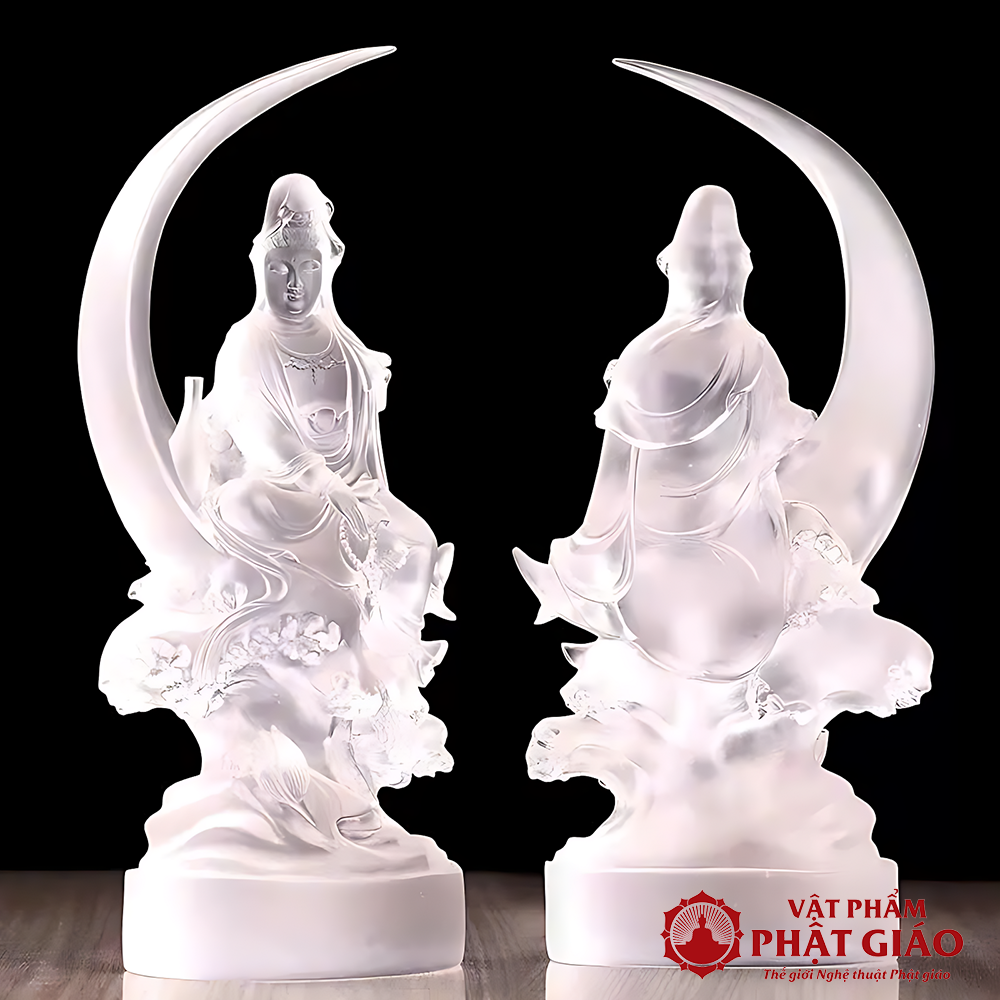 Tượng Quan Âm Bồ Tát được chế tác từ chất liệu lưu ly trắng cao cấp, mang vẻ đẹp thanh khiết, nhẹ nhàng và trang nghiêm. Hình ảnh Bồ Tát ngồi trên vầng trăng non, tay cầm tịnh bình và chuỗi hạt, thể hiện lòng từ bi cứu khổ cứu nạn, độ trì chúng sinh vượt qua khổ đau.