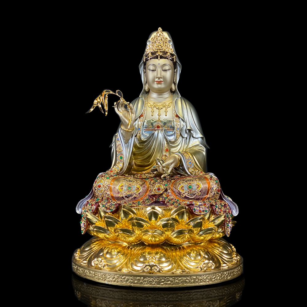 Tượng Quan Âm Bồ Tát được đúc từ đồng nguyên chất, kết hợp công nghệ men cổ sơn bạc ấn bảo vô cùng tinh xảo và sang trọng. Hình ảnh Bồ Tát ngồi kiết già trên tòa sen vàng rực rỡ, tay cầm cành dương liễu và tịnh bình cam lộ, biểu trưng cho lòng từ bi cứu khổ cứu nạn, phổ độ chúng sinh.
