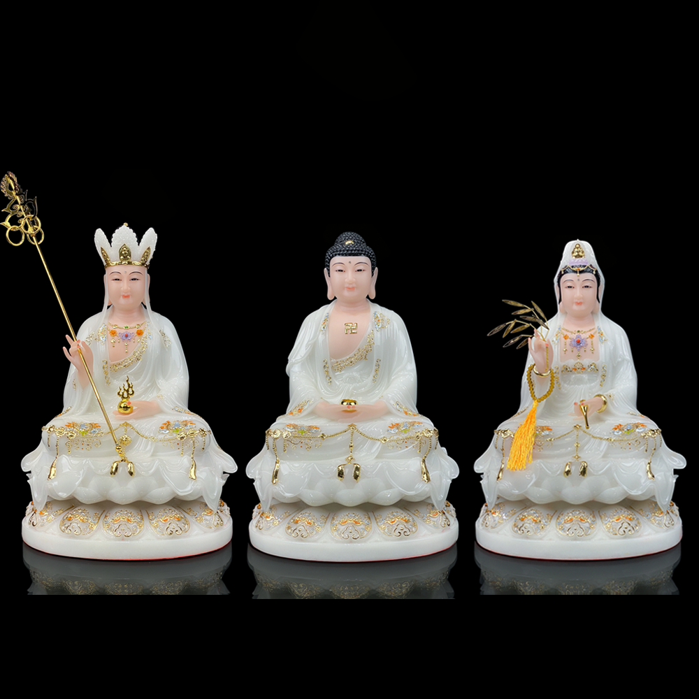 Bộ Tượng Ta Bà Tam Thánh gồm ba vị: Phật Thích Ca Mâu Ni – Địa Tạng Bồ Tát – Quan Thế Âm Bồ Tát, được chế tác từ bột đá trắng cao cấp phối viền vàng tinh xảo. Tượng ngồi trên hoa sen thanh tịnh, khuôn mặt từ bi, áo cà sa mềm mại, từng chi tiết chạm khắc khéo léo và phủ sơn bóng bền đẹp. Đây là lựa chọn lý tưởng để thờ phụng tại gia, chùa chiền hay đạo tràng.
